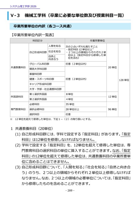 システム理工学部2026Ⅴ-3機械工学科(卒業に必要な単位数及び授業科目一覧)卒業所要単位の内訳(各コース共通)【卒業所要単位内訳一覧表】科目区分自己形成科目群卒業所要単位人間を知る社会を知る自然と向き合う次の2点いずれも満たすこと・指定科目12単位以上※・2つ以上の領域からそれぞれ2単位以上(指定科目から修得した単位を含む)共通教養科目グローバル科目群関西大学科目群基盤科目群任意(2単位以内)20単位健康・スポーツ科目群任意(2単位以内)128単位キャリア形成科目群大学・学部・社会連携科目群外国語科目第1選択外国語第2選択外国語必修科目専門教育科目選択必修科目選択科目8単位4単位35単位28単位以上任意12単位96単位12単位を超えて修得した単位は、下記1-(2)の取り扱いとする。共通教養科目(20単位)(1)自己形成科目群には、学科で設定する「指定科目」があります。「指定科目」は12単位を修得しなければなりません。(2)学科で設定する「指定科目」を、12単位を超えて修得した単位は、専門教育科目の選択科目の単位に算入することができます。なお、「指定科目」の12単位を超えて修得した単位は、共通教養科目の卒業所要単位に含めることはできません。(3)自己形成科目群について、「人間を知る」「社会を知る」「自然と向き合う」のうち、2つ以上の領域からそれぞれ2単位以上修得しなければなりません。なお、2つ以上の領域の必要単位については、「指定科目」から修得したものを含めることができます。-289-※1