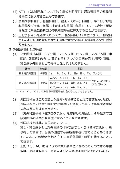 システム理工学部2026(4)グローバル科目群については2単位を限度に共通教養科目の卒業所要単位に算入することができます。(5)関西大学科目群、基盤科目群、健康・スポーツ科目群、キャリア形成科目群及び大学・学部・社会連携科目群の科目については合計2単位を限度に共通教養科目の卒業所要単位に算入することができます。(6)上記(1)~(5)を踏まえたうえで、「指定科目」12単位に加え、「指定科目」以外の共通教養科目から8単位の合計20単位を修得しなければなりません。2外国語科目(12単位)(1)7カ国語(英語、ドイツ語、フランス語、ロシア語、スペイン語、中国語、朝鮮語)のうち、英語を含む2つの外国語を第1選択外国語、第2選択外国語として修得しなければなりません。区分単位数科目第1選択外国語8単位Ⅰa、Ⅰb、Ⅱa、Ⅱb、Ⅲa、Ⅲb、Ⅳa、Ⅳb(※)Aパターン:Ⅰa、Ⅰb、Ⅱa、Ⅱb第2選択外国語4単位Bパターン:Ⅲa、Ⅲb、Ⅳa、ⅣbCパターン:Ⅴa、Ⅴb、Ⅵa、Ⅵb左記A~Ⅽいずれかのパターン※Ⅴa、Ⅴb、Ⅵa、Ⅵbは卒業所要単位に含めることはできません。外国語科目は2カ国語しか履修・修得することはできません。なお、外国語科目の所定の単位数を超過して修得した単位は卒業所要単位に含めることはできません。「海外特別研修(各プログラム)」を修得した場合は、4単位まで当該外国語の卒業所要単位に含めることができます。外国語検定試験の単位認定について第1・第2選択とした外国語の「検定認定1~3(各検定試験)」を修得した場合は、当該外国語の卒業所要単位に含めることができます。なお、この単位を上記(1)の当該外国語の単位に代えることもできます。上記(3)、(4)を合わせて卒業所要単位に含めることのできる単位数は、英語は6単位、英語以外の外国語は4単位を上限とします。2)((3)(4)(5)-290-