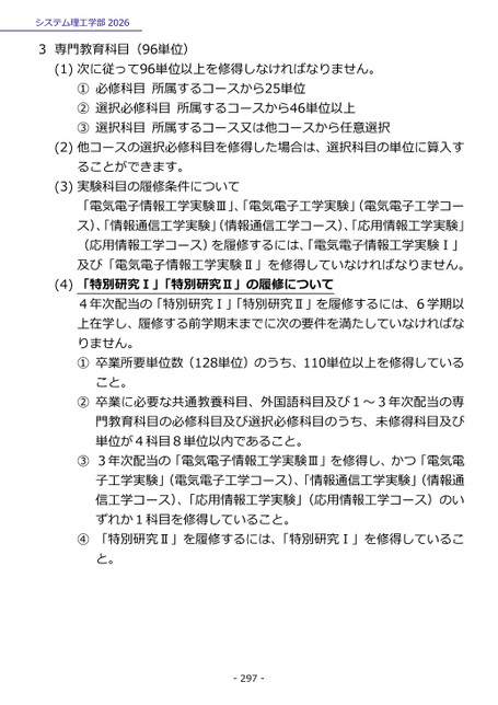 システム理工学部20263専門教育科目(96単位)(1)次に従って96単位以上を修得しなければなりません。①必修科目所属するコースから25単位②選択必修科目所属するコースから46単位以上③選択科目所属するコース又は他コースから任意選択(2)他コースの選択必修科目を修得した場合は、選択科目の単位に算入することができます。(3)実験科目の履修条件について「電気電子情報工学実験Ⅲ」、「電気電子工学実験」(電気電子工学コース)、「情報通信工学実験」(情報通信工学コース)、「応用情報工学実験」(応用情報工学コース)を履修するには、「電気電子情報工学実験Ⅰ」及び「電気電子情報工学実験Ⅱ」を修得していなければなりません。(4)「特別研究Ⅰ」「特別研究Ⅱ」の履修について4年次配当の「特別研究Ⅰ」「特別研究Ⅱ」を履修するには、6学期以上在学し、履修する前学期末までに次の要件を満たしていなければなりません。①卒業所要単位数(128単位)のうち、110単位以上を修得していること。②卒業に必要な共通教養科目、外国語科目及び1~3年次配当の専門教育科目の必修科目及び選択必修科目のうち、未修得科目及び単位が4科目8単位以内であること。③3年次配当の「電気電子情報工学実験Ⅲ」を修得し、かつ「電気電子工学実験」(電気電子工学コース)、「情報通信工学実験」(情報通信工学コース)、「応用情報工学実験」(応用情報工学コース)のいずれか1科目を修得していること。④「特別研究Ⅱ」を履修するには、「特別研究Ⅰ」を修得していること。-297-