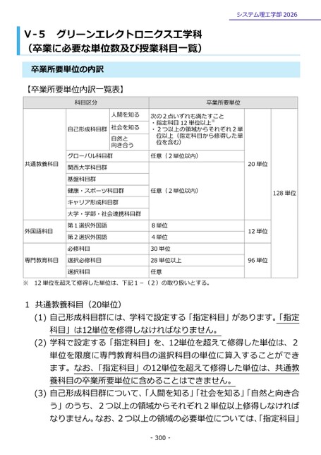 システム理工学部2026グリーンエレクトロニクス工学科Ⅴ-5(卒業に必要な単位数及び授業科目一覧)卒業所要単位の内訳【卒業所要単位内訳一覧表】科目区分自己形成科目群卒業所要単位人間を知る社会を知る自然と向き合う次の2点いずれも満たすこと・指定科目12単位以上※・2つ以上の領域からそれぞれ2単位以上(指定科目から修得した単位を含む)共通教養科目グローバル科目群関西大学科目群基盤科目群任意(2単位以内)20単位健康・スポーツ科目群任意(2単位以内)128単位キャリア形成科目群大学・学部・社会連携科目群外国語科目第1選択外国語第2選択外国語必修科目専門教育科目選択必修科目選択科目8単位4単位30単位28単位以上任意12単位96単位12単位を超えて修得した単位は、下記1-(2)の取り扱いとする。共通教養科目(20単位)(1)自己形成科目群には、学科で設定する「指定科目」があります。「指定科目」は12単位を修得しなければなりません。(2)学科で設定する「指定科目」を、12単位を超えて修得した単位は、2単位を限度に専門教育科目の選択科目の単位に算入することができます。なお、「指定科目」の12単位を超えて修得した単位は、共通教養科目の卒業所要単位に含めることはできません。(3)自己形成科目群について、「人間を知る」「社会を知る」「自然と向き合う」のうち、2つ以上の領域からそれぞれ2単位以上修得しなければなりません。なお、2つ以上の領域の必要単位については、「指定科目」-300-※1