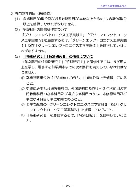 3専門教育科目(96単位)システム理工学部2026(1)(2)必修科目30単位及び選択必修科目28単位以上を含めて、合計96単位以上を修得しなければなりません。実験科目の履修条件について「グリーンエレクトロニクス工学実験Ⅲ」、「グリーンエレクトロニクス工学実験Ⅳ」を履修するには、「グリーンエレクトロニクス工学実験Ⅰ」及び「グリーンエレクトロニクス工学実験Ⅱ」を修得していなければなりません。(3)「特別研究Ⅰ」「特別研究Ⅱ」の履修について4年次配当の「特別研究Ⅰ」「特別研究Ⅱ」を履修するには、6学期以上在学し、履修する前学期末までに次の要件を満たしていなければなりません。①卒業所要単位数(128単位)のうち、110単位以上を修得していること。②卒業に必要な共通教養科目、外国語科目及び1~3年次配当の専門教育科目の必修科目及び選択必修科目のうち、未修得科目及び単位が4科目8単位以内であること。③3年次配当の「グリーンエレクトロニクス工学実験Ⅲ」及び「グリーンエレクトロニクス工学実験Ⅳ」を修得していること。④「特別研究Ⅱ」を履修するには、「特別研究Ⅰ」を修得していること。-302-