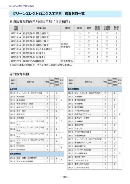システム理工学部2026グリーンエレクトロニクス工学科授業科目一覧共通教養科目自己形成科目群「指定科目」科目番号授業科目領域種別単位授業期間毎週授業時間配当年次GEC1114GEC1114GEC1114GEC1114GEC1114GEC1115GEC1115GEC1075数学を学ぶ(微分積分Ⅰ)数学を学ぶ(微分積分Ⅱ)数学を学ぶ(線形代数Ⅰ)数学を学ぶ(線形代数Ⅱ)数学を学ぶ(ベクトル解析)物理を学ぶ(力学Ⅰ)物理を学ぶ(力学Ⅱ)基礎からの情報処理社会を知る◎印の科目は必修科目で、すべて修得しなければなりません。自然と向き合う◎◎◎◎◎◎22222222111111112222222211111111授業科目単位授業期間毎週授業時間配当年次科目番号授業科目単位授業期間毎週授業時間配当年次選択必修科目GEE2グリーンエレクトロニクス応用ⅠGEE2数学解析Ⅰ1GEE2電子物性基礎GEE2信号処理IGEE2電気回路ⅢGEE2アナログ電子回路ⅠGEE2応用プログラミングGEE2エネルギーと環境GEE2数学解析ⅡGEE2電磁気学ⅡGEE2計測工学ⅠGEE2アナログ電子回路ⅡGEE2数値計算演習GEE3グリーンエレクトロニクス応用IIGEE3半導体デバイス工学GEE3基礎制御工学GEE3ディジタル電子回路GEE3データ解析演習GEE3電気電子材料GEE3LSIプロセス工学GEE3集積システム設計GEE3システム実装演習234122222222222222222222221111111111111111111111222222222222222222222223GEE1グリーンエレクトロニクス概論GEE1電気回路ⅠGEE1電気回路ⅡGEE1情報リテラシー演習GEE1基礎プログラミングGEE2確率・統計GEE2電磁気学ⅠGEE2GEE2GEE2GEE3GEE3GEE4化学基礎グリーンエレクトロニクス工学実験Ⅰグリーンエレクトロニクス工学実験Ⅱグリーンエレクトロニクス工学実験Ⅲグリーンエレクトロニクス工学実験IV特別研究ⅠGEE4特別研究Ⅱ選択必修科目GEE1振動・波動・光の物理学GEE1ディジタル回路基礎22222222222233221111111111111111222222226666──22門教育科目専科目番号必修科目-303-