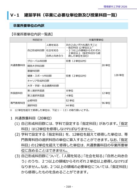環境都市工学部2026Ⅴ-1建築学科(卒業に必要な単位数及び授業科目一覧)卒業所要単位の内訳【卒業所要単位内訳一覧表】科目区分人間を知る自己形成科目群社会を知る自然と向き合う卒業所要単位次の2点いずれも満たすこと・指定科目12単位以上※・2つ以上の領域からそれぞれ2単位以上(指定科目から修得した単位を含む)グローバル科目群任意(2単位以内)共通教養科目関西大学科目群20単位基盤科目群健康・スポーツ科目群キャリア形成科目群大学・学部・社会連携科目群任意(2単位以内)128単位外国語科目専門教育科目第1選択外国語第2選択外国語必修科目選択科目8単位4単位52単位44単位12単位96単位12単位を超えて修得した単位は、下記1―(2)の取り扱いとする。共通教養科目(20単位)(1)自己形成科目群には、学科で設定する「指定科目」があります。「指定科目」は12単位を修得しなければなりません。(2)学科で設定する「指定科目」を、12単位を超えて修得した単位は、専門教育科目の選択科目の単位に算入することができます。なお、「指定科目」の12単位を超えて修得した単位は、共通教養科目の卒業所要単位に含めることはできません。(3)自己形成科目群について、「人間を知る」「社会を知る」「自然と向き合う」のうち、2つ以上の領域からそれぞれ2単位以上修得しなければなりません。なお、2つ以上の領域の必要単位については、「指定科目」から修得したものを含めることができます。-318-※1