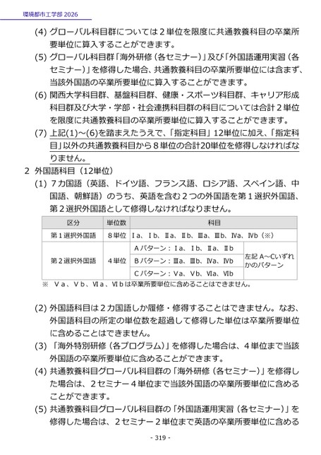 環境都市工学部2026(4)グローバル科目群については2単位を限度に共通教養科目の卒業所要単位に算入することができます。(5)グローバル科目群「海外研修(各セミナー)」及び「外国語運用実習(各セミナー)」を修得した場合、共通教養科目の卒業所要単位には含まず、当該外国語の卒業所要単位に算入することができます。(6)関西大学科目群、基盤科目群、健康・スポーツ科目群、キャリア形成科目群及び大学・学部・社会連携科目群の科目については合計2単位を限度に共通教養科目の卒業所要単位に算入することができます。(7)上記(1)~(6)を踏まえたうえで、「指定科目」12単位に加え、「指定科目」以外の共通教養科目から8単位の合計20単位を修得しなければなりません。2外国語科目(12単位)(1)7カ国語(英語、ドイツ語、フランス語、ロシア語、スペイン語、中国語、朝鮮語)のうち、英語を含む2つの外国語を第1選択外国語、第2選択外国語として修得しなければなりません。区分単位数科目第1選択外国語8単位Ⅰa、Ⅰb、Ⅱa、Ⅱb、Ⅲa、Ⅲb、Ⅳa、Ⅳb(※)Aパターン:Ⅰa、Ⅰb、Ⅱa、Ⅱb第2選択外国語4単位Bパターン:Ⅲa、Ⅲb、Ⅳa、ⅣbCパターン:Ⅴa、Ⅴb、Ⅵa、Ⅵb左記A~Ⅽいずれかのパターン※Ⅴa、Ⅴb、Ⅵa、Ⅵbは卒業所要単位に含めることはできません。(2)外国語科目は2カ国語しか履修・修得することはできません。なお、外国語科目の所定の単位数を超過して修得した単位は卒業所要単位に含めることはできません。(3)「海外特別研修(各プログラム)」を修得した場合は、4単位まで当該外国語の卒業所要単位に含めることができます。(4)共通教養科目グローバル科目群の「海外研修(各セミナー)」を修得した場合は、2セミナー4単位まで当該外国語の卒業所要単位に含めることができます。(5)共通教養科目グローバル科目群の「外国語運用実習(各セミナー)」を修得した場合は、2セミナー2単位まで英語の卒業所要単位に含める-319-