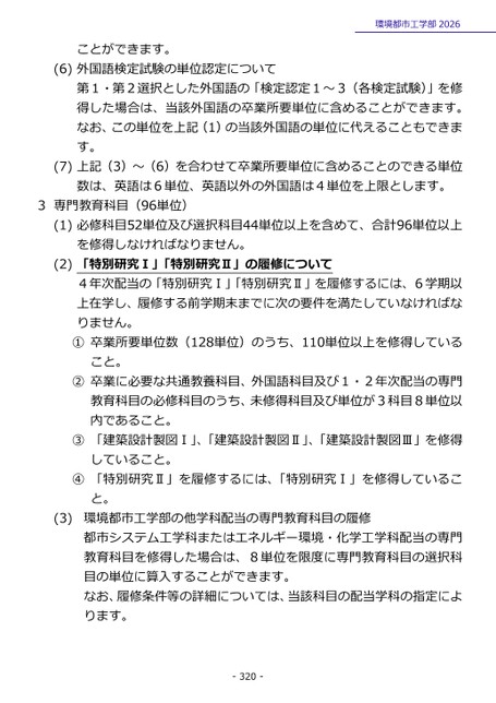 ことができます。(6)外国語検定試験の単位認定について環境都市工学部2026第1・第2選択とした外国語の「検定認定1~3(各検定試験)」を修得した場合は、当該外国語の卒業所要単位に含めることができます。なお、この単位を上記(1)の当該外国語の単位に代えることもできます。(7)上記(3)~(6)を合わせて卒業所要単位に含めることのできる単位数は、英語は6単位、英語以外の外国語は4単位を上限とします。3専門教育科目(96単位)(1)必修科目52単位及び選択科目44単位以上を含めて、合計96単位以上を修得しなければなりません。(2)「特別研究Ⅰ」「特別研究Ⅱ」の履修について4年次配当の「特別研究Ⅰ」「特別研究Ⅱ」を履修するには、6学期以上在学し、履修する前学期末までに次の要件を満たしていなければなりません。①卒業所要単位数(128単位)のうち、110単位以上を修得していること。②卒業に必要な共通教養科目、外国語科目及び1・2年次配当の専門教育科目の必修科目のうち、未修得科目及び単位が3科目8単位以内であること。③「建築設計製図Ⅰ」、「建築設計製図Ⅱ」、「建築設計製図Ⅲ」を修得していること。④「特別研究Ⅱ」を履修するには、「特別研究Ⅰ」を修得していること。(3)環境都市工学部の他学科配当の専門教育科目の履修都市システム工学科またはエネルギー環境・化学工学科配当の専門教育科目を修得した場合は、8単位を限度に専門教育科目の選択科目の単位に算入することができます。なお、履修条件等の詳細については、当該科目の配当学科の指定によります。-320-