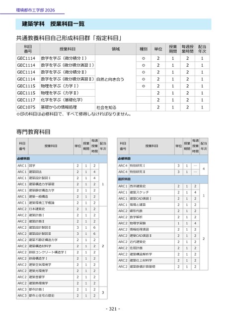 環境都市工学部2026建築学科授業科目一覧共通教養科目自己形成科目群「指定科目」科目番号授業科目領域種別単位授業期間毎週授業時間配当年次GEC1114GEC1114GEC1114GEC1114GEC1115GEC1115GEC1117GEC1075◎印の科目は必修科目で、すべて修得しなければなりません。数学を学ぶ(微分積分Ⅰ)数学を学ぶ(微分積分演習Ⅰ)数学を学ぶ(微分積分Ⅱ)数学を学ぶ(微分積分演習Ⅱ)物理を学ぶ(力学Ⅰ)物理を学ぶ(力学Ⅱ)化学を学ぶ(基礎化学)基礎からの情報処理自然と向き合う社会を知る◎◎◎◎◎22222222111111112222222211111111単位授業期間毎週授業時間配当年次科目番号必修科目授業科目単位授業期間毎週授業時間配当年次222222222233222222222211111111111111111111112442222222662222222222123ARC4特別研究ⅠARC4特別研究Ⅱ選択科目ARC1西洋建築史ARC1建築スケッチARC1建築CAD演習ⅠARC1環境と建築ARC2線形代数ARC2数学解析ARC2物理学実験ARC2情報処理演習ARC2建築CAD演習ⅡARC2近代建築史ARC2住居計画ARC2建築構造解析学ARC2建築仕上材料学ARC2建築数値計算基礎33222222122222221111111111111111――24222242222222412-321-門教育科目専科目番号授業科目必修科目ARC1図学ARC1建築図法ARC1建築設計製図ⅠARC1建築構造力学基礎ARC1建築静定構造力学ARC1建築一般構造ARC1建築環境工学概論ARC2日本建築史ARC2建築計画ⅠARC2建築計画ⅡARC2建築設計製図ⅡARC2建築設計製図ⅢARC2建築不静定構造力学ARC2建築構造材料学ARC2鉄筋コンクリート構造学ⅠARC2鉄骨構造学ⅠARC2建築空気環境学ARC2建築光環境学ARC2建築音響学ARC2建築熱環境学ARC3都市計画ⅠARC3都市と住宅の歴史