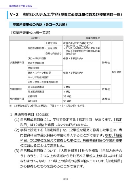 環境都市工学部2026Ⅴ-2都市システム工学科(卒業に必要な単位数及び授業科目一覧)共通教養科目科目区分人間を知る自己形成科目群社会を知る自然と向き合うグローバル科目群関西大学科目群基盤科目群健康・スポーツ科目群キャリア形成科目群大学・学部・社会連携科目群卒業所要単位次の2点いずれも満たすこと・指定科目12単位以上※・2つ以上の領域からそれぞれ2単位以上(指定科目から修得した単位を含む)任意(2単位以内)20単位任意(2単位以内)128単位12単位を超えて修得した単位は、下記1-(2)の取り扱いとする。共通教養科目(20単位)(1)自己形成科目群には、学科で設定する「指定科目」があります。「指定科目」は12単位を修得しなければなりません。(2)学科で設定する「指定科目」を、12単位を超えて修得した単位は、専門教育科目の選択科目の単位に算入することができます。なお、「指定科目」の12単位を超えて修得した単位は、共通教養科目の卒業所要単位に含めることはできません。(3)自己形成科目群について、「人間を知る」「社会を知る」「自然と向き合う」のうち、2つ以上の領域からそれぞれ2単位以上修得しなければなりません。なお、2つ以上の領域の必要単位については、「指定科目」から修得したものを含めることができます。-323-※1外国語科目専門教育科目第1選択外国語第2選択外国語必修科目選択科目8単位4単位38単位58単位12単位96単位卒業所要単位の内訳(各コース共通)【卒業所要単位内訳一覧表】