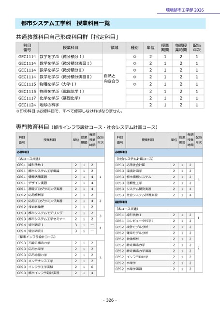 都市システム工学科授業科目一覧共通教養科目自己形成科目群「指定科目」環境都市工学部2026科目番号GEC1114GEC1114GEC1114GEC1114GEC1115GEC1115GEC1117GEC1124授業科目領域種別単位授業期間毎週授業時間配当年次数学を学ぶ(微分積分Ⅰ)数学を学ぶ(微分積分演習Ⅰ)数学を学ぶ(微分積分Ⅱ)数学を学ぶ(微分積分演習Ⅱ)物理を学ぶ(力学Ⅰ)物理を学ぶ(電磁気学Ⅰ)化学を学ぶ(基礎化学)地球の科学自然と向き合う◎◎◎◎◎22222222111111112222222211111111◎印の科目は必修科目で、すべて修得しなければなりません。門教育科目(都市インフラ設計コース・社会システム計画コース)専科目番号必修科目授業科目単位授業期間毎週授業時間配当年次科目番号必修科目授業科目単位授業期間毎週授業時間配当年次222222222222222211111111111111112222442222222222312〔社会システム計画コース〕CES3応用社会計画CES3環境計画学CES3都市情報システムCES3信頼性工学CES3システム開発実習CES3社会システム計画実習選択科目〔各コース共通〕CES1線形代数ⅡCES1コンピュータ科学ⅠCES2統計モデル分析CES2確率モデル分析CES2数値解析CES2静定構造力学CES2静定構造力学演習CES2インフラ設計学CES2水理学CES2水理学演習2222222222332222221111111111111111112244424222──22226412343-326-〔各コース共通〕CES1線形代数ⅠCES1都市システム工学概論CES1情報活用実習CES1デザイン実習CES1基礎プログラミング実習CES2応用解析学CES2応用プログラミング実習CES2技術者倫理CES3都市システムモデリングCES3都市システム工学セミナーCES4特別研究ⅠCES4特別研究Ⅱ〔都市インフラ設計コース〕CES3不静定構造力学CES3応用水理学CES3応用地盤力学CES3メンテナンス工学CES3インフラ工学実験CES3都市インフラ設計実習