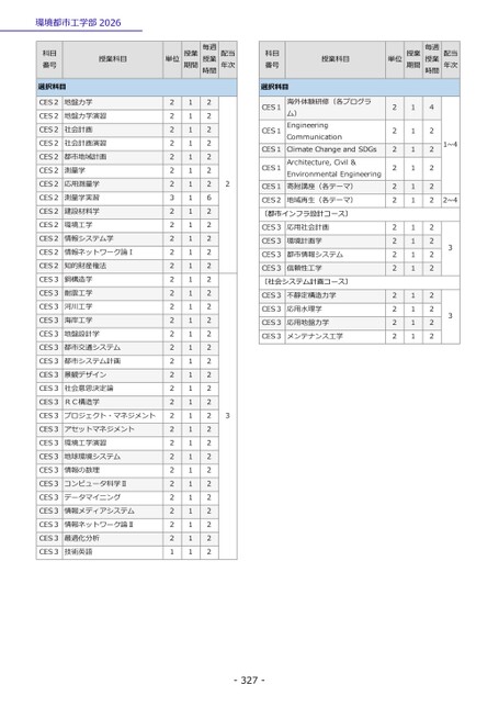環境都市工学部2026科目番号選択科目授業科目単位授業期間毎週授業時間配当年次科目番号選択科目授業科目単位授業期間毎週授業時間配当年次2222222222222211111111111111422222222222221~42~433CES1CES1CES1CES1CES1海外体験研修(各プログラム)EngineeringCommunicationClimateChangeandSDGsArchitecture,Civil&EnvironmentalEngineering寄附講座(各テーマ)CES2地域再生(各テーマ)〔都市インフラ設計コース〕CES3応用社会計画CES3環境計画学CES3都市情報システムCES3信頼性工学〔社会システム計画コース〕CES3不静定構造力学CES3応用水理学CES3応用地盤力学CES3メンテナンス工学CES2地盤力学CES2地盤力学演習CES2社会計画CES2社会計画演習CES2都市地域計画CES2測量学CES2応用測量学CES2測量学実習CES2建設材料学CES2環境工学CES2情報システム学CES2情報ネットワーク論ⅠCES2知的財産権法CES3鋼構造学CES3耐震工学CES3河川工学CES3海岸工学CES3地盤設計学CES3都市交通システムCES3都市システム計画CES3景観デザインCES3社会意思決定論CES3RC構造学CES3プロジェクト・マネジメントCES3アセットマネジメントCES3環境工学演習CES3地球環境システムCES3情報の数理CES3コンピュータ科学ⅡCES3データマイニングCES3情報メディアシステムCES3情報ネットワーク論ⅡCES3最適化分析CES3技術英語22222223222222222222222222222222211111111111111111111111111111111111222222262222222222222222222222222223-327-