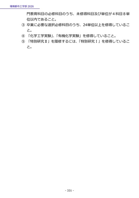 環境都市工学部2026門教育科目の必修科目のうち、未修得科目及び単位が4科目8単位以内であること。③卒業に必要な選択必修科目のうち、24単位以上を修得していること。④「化学工学実験」、「有機化学実験」を修得していること。⑤「特別研究Ⅱ」を履修するには、「特別研究Ⅰ」を修得していること。-331-
