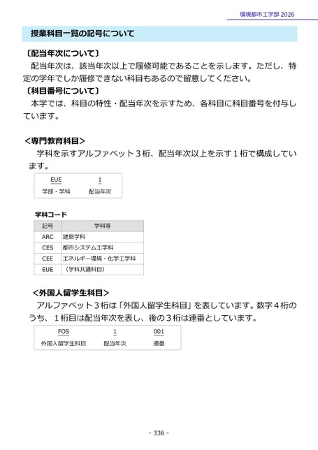 授業科目一覧の記号について〔配当年次について〕環境都市工学部2026配当年次は、該当年次以上で履修可能であることを示します。ただし、特定の学年でしか履修できない科目もあるので留意してください。〔科目番号について〕ています。本学では、科目の特性・配当年次を示すため、各科目に科目番号を付与し専門教育科目><学科を示すアルファベット3桁、配当年次以上を示す1桁で構成しています。EUE1学部・学科配当年次外国人留学生科目>アルファベット3桁は「外国人留学生科目」を表しています。数字4桁の<うち、1桁目は配当年次を表し、後の3桁は連番としています。FOS1外国人留学生科目配当年次001連番-336-科コード記号ARCCESCEEEUE学科等建築学科都市システム工学科エネルギー環境・化学工学科(学科共通科目)学