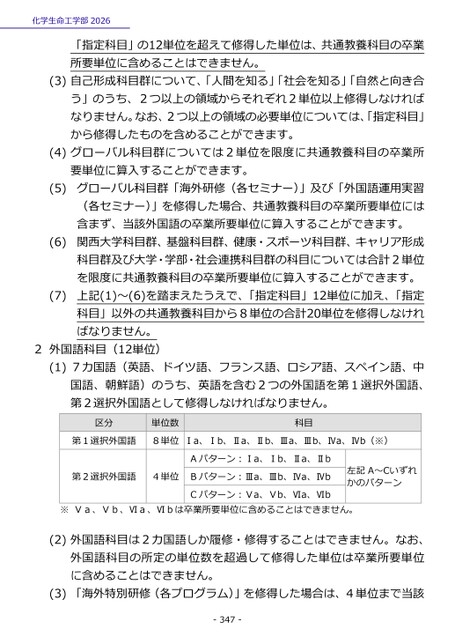 化学生命工学部2026「指定科目」の12単位を超えて修得した単位は、共通教養科目の卒業所要単位に含めることはできません。(3)自己形成科目群について、「人間を知る」「社会を知る」「自然と向き合う」のうち、2つ以上の領域からそれぞれ2単位以上修得しなければなりません。なお、2つ以上の領域の必要単位については、「指定科目」から修得したものを含めることができます。(4)グローバル科目群については2単位を限度に共通教養科目の卒業所要単位に算入することができます。(5)(6)(7)グローバル科目群「海外研修(各セミナー)」及び「外国語運用実習(各セミナー)」を修得した場合、共通教養科目の卒業所要単位には含まず、当該外国語の卒業所要単位に算入することができます。関西大学科目群、基盤科目群、健康・スポーツ科目群、キャリア形成科目群及び大学・学部・社会連携科目群の科目については合計2単位を限度に共通教養科目の卒業所要単位に算入することができます。上記(1)~(6)を踏まえたうえで、「指定科目」12単位に加え、「指定科目」以外の共通教養科目から8単位の合計20単位を修得しなければなりません。2外国語科目(12単位)(1)7カ国語(英語、ドイツ語、フランス語、ロシア語、スペイン語、中国語、朝鮮語)のうち、英語を含む2つの外国語を第1選択外国語、第2選択外国語として修得しなければなりません。区分単位数科目第1選択外国語8単位Ⅰa、Ⅰb、Ⅱa、Ⅱb、Ⅲa、Ⅲb、Ⅳa、Ⅳb(※)Aパターン:Ⅰa、Ⅰb、Ⅱa、Ⅱb第2選択外国語4単位Bパターン:Ⅲa、Ⅲb、Ⅳa、ⅣbCパターン:Ⅴa、Ⅴb、Ⅵa、Ⅵb左記A~Ⅽいずれかのパターン※Ⅴa、Ⅴb、Ⅵa、Ⅵbは卒業所要単位に含めることはできません。(2)外国語科目は2カ国語しか履修・修得することはできません。なお、外国語科目の所定の単位数を超過して修得した単位は卒業所要単位に含めることはできません。(3)「海外特別研修(各プログラム)」を修得した場合は、4単位まで当該-347-