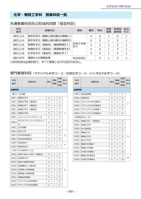 化学・物質工学科授業科目一覧化学生命工学部2026共通教養科目自己形成科目群「指定科目」科目番号GEC1114GEC1114GEC1116GEC1116GEC1118GEC1075授業科目領域種別単位数学を学ぶ(関数と微分積分の基礎Ⅰ)数学を学ぶ(関数と微分積分の基礎Ⅱ)物理を学ぶ(演習含)(基礎物理学Ⅰ)物理を学ぶ(演習含)(基礎物理学Ⅱ)化学を学ぶ(演習含)(基礎化学Ⅰ)基礎からの情報処理自然と向き合う社会を知る◎◎◎◎◎222242授業期間毎週授業時間配当年次111111222242111111◎印の科目は必修科目で、すべて修得しなければなりません。門教育科目(マテリアル科学コース・応用化学コース・バイオ分子化学コース)専科目番号必修科目授業科目単位授業期間毎週授業時間配当年次科目番号必修科目授業科目単位授業期間毎週授業時間配当年次22222244222222424111111111111111112222664422222612212323CME3技術者倫理CME3金属材料CME3マテリアル科学演習ⅠCME3マテリアル科学演習ⅡCME3マテリアル工学実験ⅠCME3マテリアル工学実験Ⅱ〔応用化学コース〕CME2有機化学Ⅰ(演習含)CME2有機化学ⅡCME2反応速度論CME2無機化学ⅠCME2無機化学ⅡCME2高分子化学CME2機器分析演習ⅠCME2基礎化学実験CME2応用化学実験ⅠCME3機器分析演習ⅡCME3応用化学実験Ⅱ-350-〔各コース共通〕CME1基礎化学ⅡCME1基礎化学Ⅲ(演習含)CME1物理化学Ⅰ(演習含)CME1物理化学Ⅱ(演習含)CME1物理化学ⅢCME1CME1CME1フレッシュマンゼミナールオリエンテーションゼミナール化学実験CME3安全工学CME3科学技術英語ⅠCME3科学技術英語ⅡCME4特別研究ⅠCME4特別研究Ⅱ〔マテリアル科学コース〕CME2材料の強さと変形(演習含)CME2材料熱力学CME2固体の物理的性質CME2結晶構造とX線回折CME2状態図と材料組織CME2速度論と物質移動CME2情報処理演習CME2マテリアル科学実験ⅠCME2マテリアル科学実験Ⅱ2444222121133422222222111111111111111111111124442224222――4222222661342
