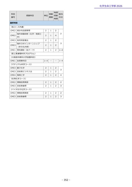 化学生命工学部2026-352-科目番号授業科目単位授業期間毎週授業時間配当年次選択科目〔各コース共通〕CME2CME2CME3CME3CME1統計的品質管理海外体験研修(化学・物質工学)知的財産権法海外ラボインターンシップ(多文化共修)寄附講座(各テーマ)〔医工薬連環科学プログラム〕〔大阪医科薬科大学設置科目〕CME1各授業科目〔マテリアル科学コース〕CME3量子化学CME3技術者ビジネス法CME4環境工学〔応用化学コース〕CME2情報処理演習CME3技術者倫理〔バイオ分子化学コース〕CME2情報処理演習CME3技術者倫理222221111124222231~41~4――1~4222222211111112222222342323