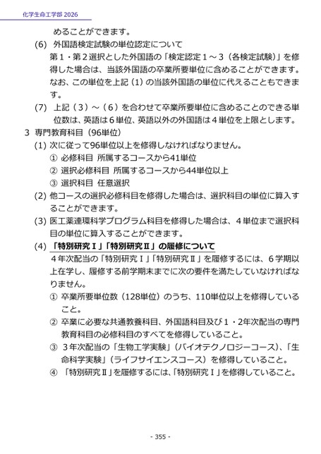 化学生命工学部2026めることができます。外国語検定試験の単位認定について(6)第1・第2選択とした外国語の「検定認定1~3(各検定試験)」を修得した場合は、当該外国語の卒業所要単位に含めることができます。なお、この単位を上記(1)の当該外国語の単位に代えることもできます。上記(3)~(6)を合わせて卒業所要単位に含めることのできる単位数は、英語は6単位、英語以外の外国語は4単位を上限とします。(7)3専門教育科目(96単位)(1)次に従って96単位以上を修得しなければなりません。①必修科目所属するコースから41単位②選択必修科目所属するコースから44単位以上③選択科目任意選択(2)他コースの選択必修科目を修得した場合は、選択科目の単位に算入することができます。(3)医工薬連環科学プログラム科目を修得した場合は、4単位まで選択科目の単位に算入することができます。(4)「特別研究Ⅰ」「特別研究Ⅱ」の履修について4年次配当の「特別研究Ⅰ」「特別研究Ⅱ」を履修するには、6学期以上在学し、履修する前学期末までに次の要件を満たしていなければなりません。①卒業所要単位数(128単位)のうち、110単位以上を修得していること。②卒業に必要な共通教養科目、外国語科目及び1・2年次配当の専門教育科目の必修科目のすべてを修得していること。③3年次配当の「生物工学実験」(バイオテクノロジーコース)、「生命科学実験」(ライフサイエンスコース)を修得していること。④「特別研究Ⅱ」を履修するには、「特別研究Ⅰ」を修得していること。-355-