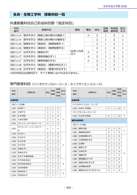 生命・生物工学科授業科目一覧共通教養科目自己形成科目群「指定科目」化学生命工学部2026科目番号授業科目領域種別単位授業期間毎週授業時間配当年次GEC1114GEC1114GEC1116GEC1116GEC1117GEC1117GEC1117GEC1118GEC1118◎印の科目は必修科目で、すべて修得しなければなりません。数学を学ぶ(関数と微分積分の基礎Ⅰ)数学を学ぶ(関数と微分積分の基礎Ⅱ)物理を学ぶ(演習含)(基礎物理学Ⅰ)物理を学ぶ(演習含)(基礎物理学Ⅱ)化学を学ぶ(基礎化学)化学を学ぶ(基礎有機化学Ⅰ)化学を学ぶ(基礎有機化学Ⅱ)化学を学ぶ(演習含)(基礎分析化学Ⅰ)化学を学ぶ(演習含)(基礎分析化学Ⅱ)自然と向き合う◎◎◎◎222222222111111111222222222111111111門教育科目(バイオテクノロジーコース・ライフサイエンスコース)専科目番号授業科目必修科目〔各コース共通〕単位授業期間毎週授業時間配当年次科目番号必修科目授業科目単位授業期間毎週授業時間配当年次生物学Ⅰ生物学Ⅱ化学実験生物学実験フレッシュマンゼミナールオリエンテーションゼミナール生化学Ⅰ生化学Ⅱ生化学Ⅲ生化学Ⅳ有機化学Ⅰ有機化学Ⅱ生命工学基礎実験科学技術英語Ⅰ科学技術英語Ⅱ技術者倫理特別研究Ⅰ特別研究Ⅱ22122222222241123311111111111111111122462222222212222――1234LSB1LSB1LSB1LSB1LSB1LSB1LSB2LSB2LSB2LSB2LSB2LSB2LSB2LSB3LSB3LSB3LSB4LSB4〔バイオテクノロジーコース〕LSB3生物工学実験〔ライフサイエンスコース〕LSB3生命科学実験選択必修科目〔各コース共通〕LSB1LSB1LSB2LSB2LSB2LSB2LSB2LSB2LSB2LSB2LSB2LSB2線形代数基礎微生物学生物物理化学Ⅰ生物物理化学Ⅱ生理学酵素工学分析化学機器分析基礎遺伝子工学基礎生物化学工学応用微生物学基礎生命工学コロキウム442222222222223312111111111111111212222222222222-356-