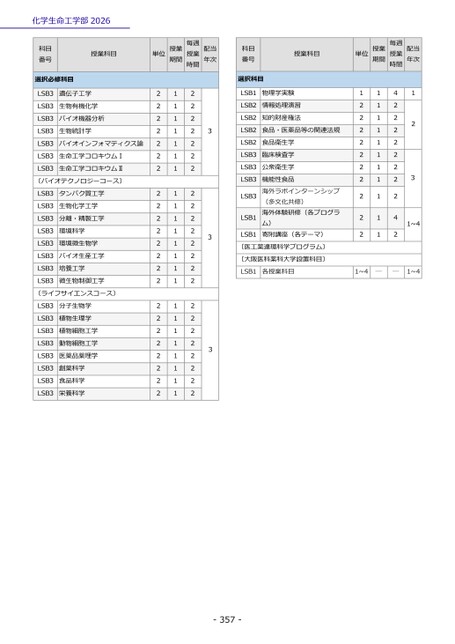 単位授業期間毎週授業時間配当年次科目番号選択科目授業科目単位授業期間毎週授業時間配当年次LSB1LSB2LSB2LSB2LSB2LSB3LSB3LSB3LSB3LSB1LSB1物理学実験情報処理演習知的財産権法食品・医薬品等の関連法規食品衛生学臨床検査学公衆衛生学機能性食品海外ラボインターンシップ(多文化共修)海外体験研修(各プログラム)寄附講座(各テーマ)〔医工薬連環科学プログラム〕〔大阪医科薬科大学設置科目〕12222222222111111111111231~442222222242LSB1各授業科目1~4――1~4222222222222222222222221111111111111111111111122222222222222222222222333-357-化学生命工学部2026授業科目科目番号選択必修科目LSB3LSB3LSB3LSB3LSB3LSB3LSB3遺伝子工学生物有機化学バイオ機器分析生物統計学バイオインフォマティクス論生命工学コロキウムⅠ生命工学コロキウムⅡ〔バイオテクノロジーコース〕LSB3LSB3LSB3LSB3LSB3LSB3LSB3LSB3タンパク質工学生物化学工学分離・精製工学環境科学環境微生物学バイオ生産工学培養工学微生物制御工学〔ライフサイエンスコース〕LSB3LSB3LSB3LSB3LSB3LSB3LSB3LSB3分子生物学植物生理学植物細胞工学動物細胞工学医薬品薬理学創薬科学食品科学栄養科学