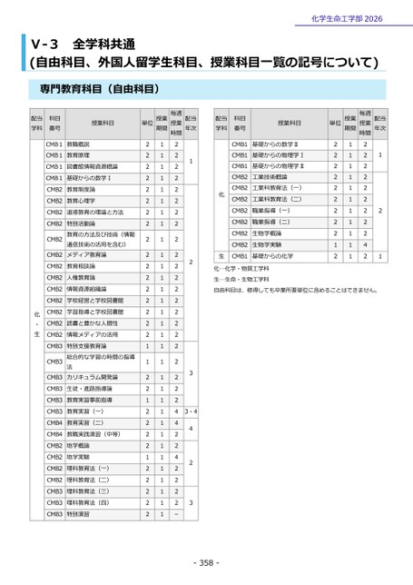 化学生命工学部2026全学科共通Ⅴ-3(自由科目、外国人留学生科目、授業科目一覧の記号について)専門教育科目(自由科目)配当学科科目番号授業科目単位授業期間毎週授業時間配当年次配当学科科目番号授業科目単位授業期間毎週授業時間配当年次化CMB1CMB1CMB1CMB2CMB2基礎からの数学Ⅱ基礎からの物理学Ⅰ基礎からの物理学Ⅱ工業技術概論工業科教育法(一)CMB2工業科教育法(二)CMB2職業指導(一)CMB2職業指導(二)CMB2生物学概論CMB2生物学実験生CMB1基礎からの化学化…化学・物質工学科生…生命・生物工学科222222222121111111111122222222242121自由科目は、修得しても卒業所要単位に含めることはできません。22222222222222222222224422422221233・4423--358-1111111111111111111111111111111122222222222222222112212222122222CMB1CMB1教職概説教育原理CMB1図書館情報資源概論CMB1基礎からの数学ⅠCMB2教育制度論CMB2教育心理学CMB2道徳教育の理論と方法CMB2CMB2CMB2特別活動論教育の方法及び技術(情報通信技術の活用を含む)メディア教育論CMB2教育相談論CMB2人権教育論CMB2情報資源組織論CMB2学校経営と学校図書館CMB2学習指導と学校図書館CMB2読書と豊かな人間性CMB2情報メディアの活用化・生CMB3CMB3CMB3特別支援教育論総合的な学習の時間の指導法カリキュラム開発論CMB3生徒・進路指導論CMB3教育実習事前指導CMB3教育実習(一)CMB4教育実習(二)CMB4教職実践演習(中等)CMB2地学概論CMB2地学実験CMB2理科教育法(一)CMB2理科教育法(二)CMB3理科教育法(三)CMB3理科教育法(四)CMB3特別演習