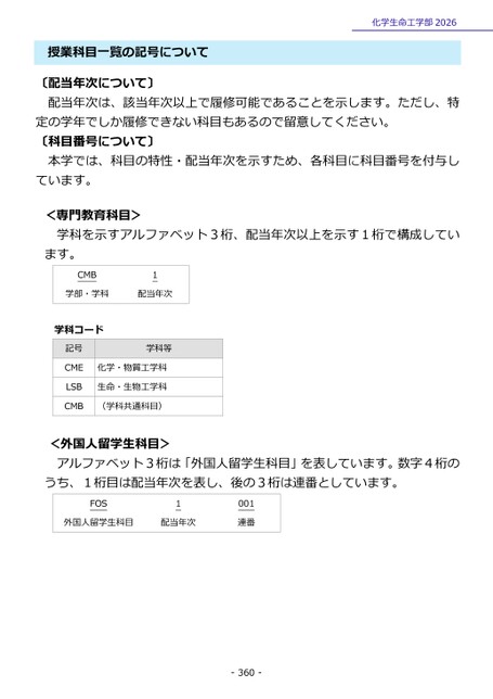 授業科目一覧の記号について〔配当年次について〕化学生命工学部2026配当年次は、該当年次以上で履修可能であることを示します。ただし、特定の学年でしか履修できない科目もあるので留意してください。〔科目番号について〕本学では、科目の特性・配当年次を示すため、各科目に科目番号を付与しています。専門教育科目>学科を示すアルファベット3桁、配当年次以上を示す1桁で構成してい<ます。CMB1学部・学科配当年次科コード学記号CMELSB学科等化学・物質工学科生命・生物工学科CMB(学科共通科目)外国人留学生科目>アルファベット3桁は「外国人留学生科目」を表しています。数字4桁の<うち、1桁目は配当年次を表し、後の3桁は連番としています。FOS1外国人留学生科目配当年次001連番-360-