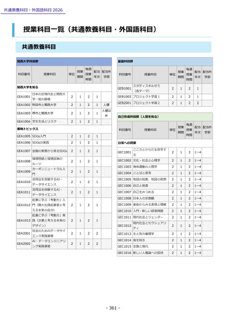科目番号授業科目関西大学を知るGEA1001GEA1002日本の近現代史と関西大学─知の群像吹田市と関西大学GEA1003堺市と関西大学GEA1004学生生活とリスク戦略トピックスGEA1005SDGs入門GEA1006SDGsの実践GEA1007金融の実務から見るSDGsGEA1008GEA1009GEA1010GEA1011GEA1012GEA1013GEA2001GEA2002環境問題と環境政策のルーツカーボンニュートラル入門活用法を見聞するAI・データサイエンス活用法を体験するAI・データサイエンス起業に学ぶ「考動力」入門(関大出身起業家と考える未来の自分)起業に学ぶ「考動力」実践(企業と考える未来のデザイン)社会のためのデータサイエンス実践基礎AI・データエンジニアリング実践基礎単位授業期間毎週授業時間配当年次配当外学部人健人健以外222222222222222111111111111111222222222222222111111111111122科目番号授業科目GEB1001GEB1002スタディスキルゼミ(各テーマ)プロジェクト学習1GEB2001プロジェクト学習2自己形成科目群(人間を知る)科目番号授業科目単位授業期間222111単位授業期間毎週授業時間222毎週授業時間配当年次配当外学部112配当年次配当外学部日常への洞察GEC1001GEC1002こころとからだを哲学する文化・社会と心理学GEC1003身体運動の人間学GEC1004ことばと思考GEC1005地図の知恵、地図の思想GEC1006自己と他者GEC1007自己をみつめるGEC1008日本人の宗教観GEC1009美術からみる表現と理解GEC1010入門・新しい部落問題GEC1011GEC1012GEC1013現代社会とジェンダー現代社会とセクシュアリティ生と死の倫理学GEC1014食を知るGEC1015宗教と現代GEC1016新しい人権論への招待2222222222222222111111111111111122222222222222221~41~41~41~41~41~41~41~41~41~41~41~41~41~41~41~4-361-共通教養科目・外国語科目2026授業科目一覧(共通教養科目・外国語科目)共通教養科目関西大学科目群基盤科目群