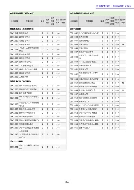 -362-共通教養科目・外国語科目2026自己形成科目群(人間を知る)科目番号授業科目単位授業期間授業毎週時間配当年次配当外学部教養を深める(知の見取り図)GEC1017哲学を学ぶ2121~4GEC1018論理学を学ぶ2121~4GEC1019心理学を学ぶ2121~4GEC1020考古学を学ぶイスラーム世界の歴史を宗教学を学ぶ学ぶ2121~4GEC10212121~4GEC10222121~4GEC1023日本語を学ぶ2121~4GEC1024日本文学を学ぶ2121~4GEC1025人文地理学を学ぶ2121~4GEC1026地域社会の生活と資源2121~4GEC1027芸術学を学ぶ2121~4GEC1028人類学入門2121~4教養を深める(知の探究)GEC1029日本の古典文学を読む2121~4GEC1030日本の近代文学を読む2121~4GEC1031考える子供から大人への過程をるわかる諸子百家日本の文化と人間を考え社会と個人の心理学2121~4GEC10322121~4GEC10332121~4GEC10342121~4GEC1035世界の文学を味わう2121~4GEC1036西洋美術を味わう2121~4GEC1037日本・東洋美術を味わう2121~4GEC1038文化史に親しもう2121~4GEC1039~大学の主人公はきみたアジアの文化と世界遺産大学教育論ちだ!~2121~4GEC10402121~4チャレンジ科目GEC1041チャレンジ科目(各テーマ)2121~4自己形成科目群(社会を知る)科目番号授業科目単位授業期間授業毎週時間配当年次配当外学部日常への洞察GEC1042今日の道徳的ディレンマ2121~4GEC1043世界の宗教2121~4GEC1044環境の倫理学2121~4GEC1045企業と社会2121~4商GEC1046技術と社会2121~4GEC1047門メディア・リテラシー入生活の中の経済学イスラム社会を考える2121~4GEC10482121~4GEC10492121~4GEC1050日本の伝統文化2121~4GEC1051ン方言学入門共生社会のライフデザイ日本の社会と生活の歴史2121~4GEC10522121~4GEC10532121~4GEC1054優良企業の見分け方2121~4商GEC1055社会学で学ぶ現代社会2121~4GEC1056政治学と21世紀社会2121~4法GEC1057法実務入門2121~4GEC1058旅から始める知の冒険2121~4GEC1059移動する人々2121~4GEC1060オリンピックの共生思想2121~4GEC1061外来文化と日本の歴史2121~4GEC1062アジアの中の日本歴史2121~4GEC1063世界の中の日本経済2121~4GEC1064日本史の中の平和と戦争2121~4GEC1065世界史の中の平和と戦争2121~4GEC1066読書への誘い2121~4