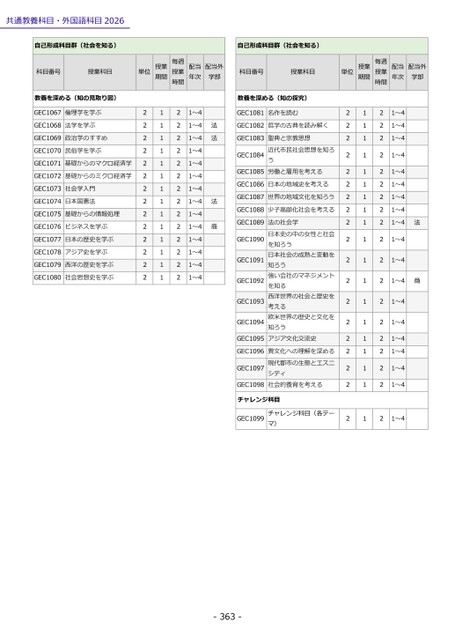 単位授業期間毎週授業時間配当年次配当外学部科目番号授業科目単位授業期間毎週授業時間配当年次配当外学部11111111111111111112222222222222222221~41~41~41~41~41~41~41~41~41~41~4法1~4商1~41~41~41~41~41~421~42222222222222211111111111111法法法商222222222222221~41~41~41~41~41~41~41~41~41~41~41~41~41~4教養を深める(知の探究)GEC1081名作を読むGEC1082哲学の古典を読み解くGEC1083GEC1084GEC1085聖典と宗教思想近代市民社会思想を知ろう労働と雇用を考えるGEC1086日本の地域史を考えるGEC1087世界の地域文化を知ろうGEC1088少子高齢化社会を考えるGEC1089GEC1090GEC1091GEC1092GEC1093GEC1094GEC1095GEC1096GEC1097GEC1098法の社会学日本史の中の女性と社会を知ろう日本社会の成熟と変動を知ろう強い会社のマネジメントを知る西洋世界の社会と歴史を考える欧米世界の歴史と文化を知ろうアジア文化交流史異文化への理解を深める現代都市の生態とエスニシティ社会的養育を考えるチャレンジ科目GEC1099チャレンジ科目(各テーマ)2222222222222222222-363-科目番号授業科目教養を深める(知の見取り図)GEC1067倫理学を学ぶGEC1068法学を学ぶGEC1069政治学のすすめGEC1070民俗学を学ぶGEC1071基礎からのマクロ経済学GEC1072基礎からのミクロ経済学GEC1073社会学入門GEC1074日本国憲法GEC1075基礎からの情報処理GEC1076ビジネスを学ぶGEC1077日本の歴史を学ぶGEC1078アジア史を学ぶGEC1079西洋の歴史を学ぶGEC1080社会思想史を学ぶ共通教養科目・外国語科目2026自己形成科目群(社会を知る)自己形成科目群(社会を知る)