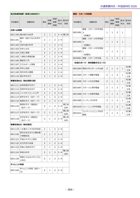 111111111111222222222222111211111111外/理工系外/理工系外/理工系外/理工系外/理工系外/理工系外/理工系外/理工系単位授業期間毎週授業時間配当年次配当外学部科目番号授業科目単位授業期間毎週授業時間配当年次配当外学部健康・スポーツ科学実習各種目)a(GED10011~4理工系自己形成科目群(自然と向き合う)健康・スポーツ科目群共通教養科目・外国語科目20261112健康・スポーツ科学実習健康・スポーツ科学実習GED2001健康・スポーツ科学論各種目)c(GED1003各種目)b(GED1002(生涯スポーツ・身体運動文化コース)GED1004関西大学スポーツ文化論GED1005スポーツ運動学概論GED1006スポーツ社会学概論GED1007スポーツ心理学概論GED1008スポーツ栄養学概論GED1009コーチングの科学GED1010トレーニング科学概論GED1011コンディショニング科学概論22222222222222222222222222222222221~41~41~41~41~41~41~41~41~41~41~41~41~41~41~41~41~41~41~41~41~41~41~41~41~4理工系以外理工系以外理工系以外理工系以外21~4-364-222222222222222222222222222111111111111111111111111111科目番号授業科目日常への洞察GEC1100GEC1101GEC1102身の回りの化学確率・統計でものを考える自然災害の科学GEC1103科学と文化GEC1104生物と環境GEC1105人類紀の環境変動GEC1106建築学入門GEC1107エネルギーと環境GEC1108科学と技術GEC1109現代科学の展開GEC1110統計学を学ぶ教養を深める(知の見取り図)GEC1111自然地理学を学ぶGEC1112自然科学史を学ぶGEC1113バイオサイエンス入門GEC1114数学を学ぶ(各テーマ)GEC1115GEC1116物理を学ぶ(各テーマ)物理を学ぶ(演習含)(各テーマ)GEC1117化学を学ぶ(各テーマ)GEC1118化学を学ぶ(演習含)(各テーマ)教養を深める(知の探究)GEC1119GEC1120GEC1121人を豊かにする科学技術現代社会を支える電気電子情報技術宇宙のすがたと歴史GEC1122近代科学の系譜GEC1123気象と気候を学ぶGEC1124地球の科学GEC1125地震と火山のメカニズムと防災チャレンジ科目GEC1126チャレンジ科目(各テーマ)