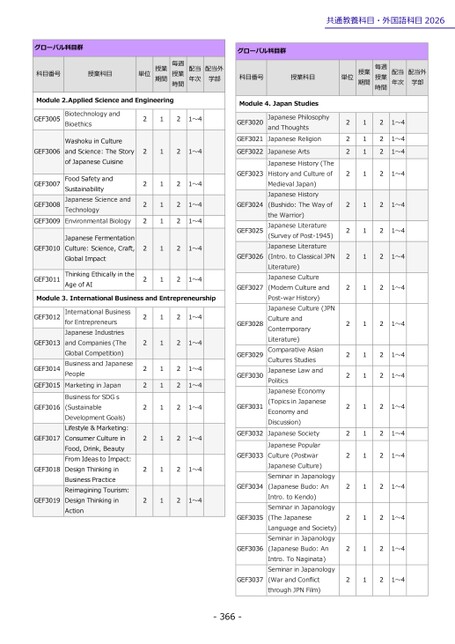 共通教養科目・外国語科目2026グローバル科目群科目番号授業科目Module4.JapanStudies単位授業期間毎週授業時間配当年次配当外学部GEF3020GEF3021GEF3022GEF3023GEF3024GEF3025GEF3026GEF3027GEF3028GEF3029GEF3030GEF3031GEF3032GEF3033GEF3034JapanesePhilosophyandThoughtsJapaneseReligionJapaneseArtsJapaneseHistory(TheHistoryandCultureofMedievalJapan)JapaneseHistory(Bushido:TheWayoftheWarrior)JapaneseLiterature(SurveyofPost-1945)JapaneseLiterature(Intro.toClassicalJPNLiterature)JapaneseCulture(ModernCultureandPost-warHistory)JapaneseCulture(JPNCultureandContemporaryLiterature)ComparativeAsianCulturesStudiesJapaneseLawandPoliticsJapaneseEconomy(TopicsinJapaneseEconomyandDiscussion)JapaneseSocietyJapanesePopularCulture(PostwarJapaneseCulture)SeminarinJapanology(JapaneseBudo:AnIntro.toKendo)SeminarinJapanology(TheJapaneseLanguageandSociety)SeminarinJapanology(JapaneseBudo:AnIntro.ToNaginata)SeminarinJapanology(WarandConflictthroughJPNFilm)22222222222222222211111111111111111122222221~41~41~41~41~41~41~421~421~4222221~41~41~41~41~421~421~421~421~4GEF3035GEF3036GEF3037-366-グローバル科目群科目番号授業科目単位授業期間毎週授業時間配当年次配当外学部Module2.AppliedScienceandEngineeringGEF3005BiotechnologyandBioethicsGEF3006WashokuinCultureandScience:TheStoryofJapaneseCuisineGEF3007GEF3008GEF3009FoodSafetyandSustainabilityJapaneseScienceandTechnologyEnvironmentalBiologyGEF3010JapaneseFermentationCulture:Science,Craft,GlobalImpactGEF3011ThinkingEthicallyintheAgeofAI2222222111111121~421~422221~41~41~41~421~4Module3.InternationalBusinessandEntrepreneurshipGEF3012GEF3013GEF3014GEF3015GEF3016GEF3017GEF3018GEF3019InternationalBusinessforEntrepreneursJapaneseIndustriesandCompanies(TheGlobalCompetition)BusinessandJapanesePeopleMarketinginJapanBusinessforSDGs(SustainableDevelopmentGoals)Lifestyle&Marketing:ConsumerCultureinFood,Drink,BeautyFromIdeastoImpact:DesignThinkinginBusinessPracticeReimaginingTourism:DesignThinkinginAction2222222211111111222221~41~41~41~41~421~421~421~4