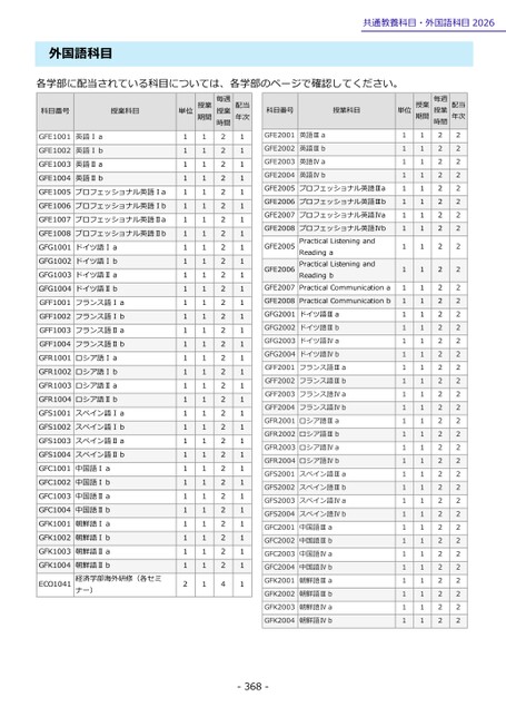 -368-共通教養科目・外国語科目2026外国語科目各学部に配当されている科目については、各学部のページで確認してください。科目番号授業科目単位期間授業時間毎週授業年次配当GFE1001英語Ⅰa1121GFE1002英語Ⅰb1121GFE1003英語Ⅱa1121GFE1004英語Ⅱb1121GFE1005プロフェッショナル英語Ⅰa1121GFE1006プロフェッショナル英語Ⅰb1121GFE1007プロフェッショナル英語Ⅱa1121GFE1008プロフェッショナル英語Ⅱb1121GFG1001ドイツ語Ⅰa1121GFG1002ドイツ語Ⅰb1121GFG1003ドイツ語Ⅱa1121GFG1004ドイツ語Ⅱb1121GFF1001フランス語Ⅰa1121GFF1002フランス語Ⅰb1121GFF1003フランス語Ⅱa1121GFF1004フランス語Ⅱb1121GFR1001ロシア語Ⅰa1121GFR1002ロシア語Ⅰb1121GFR1003ロシア語Ⅱa1121GFR1004ロシア語Ⅱb1121GFS1001スペイン語Ⅰa1121GFS1002スペイン語Ⅰb1121GFS1003スペイン語Ⅱa1121GFS1004スペイン語Ⅱb1121GFC1001中国語Ⅰa1121GFC1002中国語Ⅰb1121GFC1003中国語Ⅱa1121GFC1004中国語Ⅱb1121GFK1001朝鮮語Ⅰa1121GFK1002朝鮮語Ⅰb1121GFK1003朝鮮語Ⅱa1121GFK1004ナー)朝鮮語Ⅱb経済学部海外研修(各セミ1121ECO10412141科目番号授業科目単位期間授業時間毎週授業年次配当GFE2001英語Ⅲa1122GFE2002英語Ⅲb1122GFE2003英語Ⅳa1122GFE2004英語Ⅳb1122GFE2005プロフェッショナル英語Ⅲa1122GFE2006プロフェッショナル英語Ⅲb1122GFE2007プロフェッショナル英語Ⅳa1122GFE2008PracticalCommunicationaPracticalListeningandReadingaプロフェッショナル英語ⅣbPracticalListeningandReadingb1122GFE20051122GFE20061122GFE20071122GFE2008PracticalCommunicationb1122GFG2001ドイツ語Ⅲa1122GFG2002ドイツ語Ⅲb1122GFG2003ドイツ語Ⅳa1122GFG2004ドイツ語Ⅳb1122GFF2001フランス語Ⅲa1122GFF2002フランス語Ⅲb1122GFF2003フランス語Ⅳa1122GFF2004フランス語Ⅳb1122GFR2001ロシア語Ⅲa1122GFR2002ロシア語Ⅲb1122GFR2003ロシア語Ⅳa1122GFR2004ロシア語Ⅳb1122GFS2001スペイン語Ⅲa1122GFS2002スペイン語Ⅲb1122GFS2003スペイン語Ⅳa1122GFS2004スペイン語Ⅳb1122GFC2001中国語Ⅲa1122GFC2002中国語Ⅲb1122GFC2003中国語Ⅳa1122GFC2004中国語Ⅳb1122GFK2001朝鮮語Ⅲa1122GFK2002朝鮮語Ⅲb1122GFK2003朝鮮語Ⅳa1122GFK2004朝鮮語Ⅳb1122