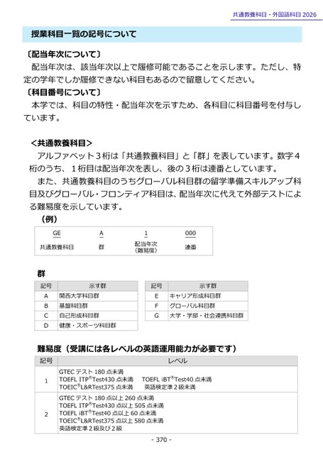 授業科目一覧の記号について〔配当年次について〕共通教養科目・外国語科目2026配当年次は、該当年次以上で履修可能であることを示します。ただし、特定の学年でしか履修できない科目もあるので留意してください。〔科目番号について〕本学では、科目の特性・配当年次を示すため、各科目に科目番号を付与しています。共通教養科目>アルファベット3桁は「共通教養科目」と「群」を表しています。数字4<桁のうち、1桁目は配当年次を表し、後の3桁は連番としています。また、共通教養科目のうちグローバル科目群の留学準備スキルアップ科目及びグローバル・フロンティア科目は、配当年次に代えて外部テストによる難易度を示しています。A群1配当年次(難易度)000連番記号EFG示す群キャリア形成科目群グローバル科目群大学・学部・社会連携科目群易度(受講には各レベルの英語運用能力が必要です)難記号12レベルTOEFLiBTⓇTest40点未満英語検定準2級未満GTECテスト180点未満TOEFLITPⓇTest430点未満TOEICⓇL&RTest375点未満GTECテスト180点以上260点未満TOEFLITPⓇTest430点以上505点未満TOEFLiBTⓇTest40点以上60点未満TOEICⓇL&RTest375点以上580点未満英語検定準2級及び2級-370-示す群ABCD関西大学科目群基盤科目群自己形成科目群健康・スポーツ科目群(例)GE共通教養科目群記号