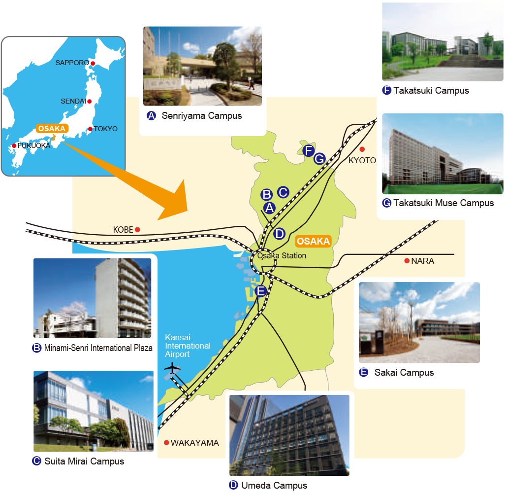 Campuses of Kansai University are located in Osaka, the biggest city in Western Japan. Osaka is well-known as a metropolis at the forefront in disseminating cultural information throughout history. Other important cities such as Kyoto, Nara and Kobe are all located within about an hour’s train ride, giving Kansai University’s international students many opportunities to explore Japan’s history and culture.