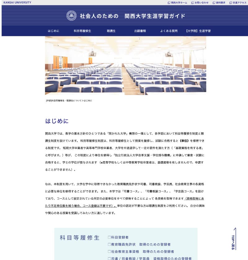 関西大学では、教学の基本方針のひとつである「開かれた大学」構想の一環として、各学部において、科目等履修生制度を設けています。
