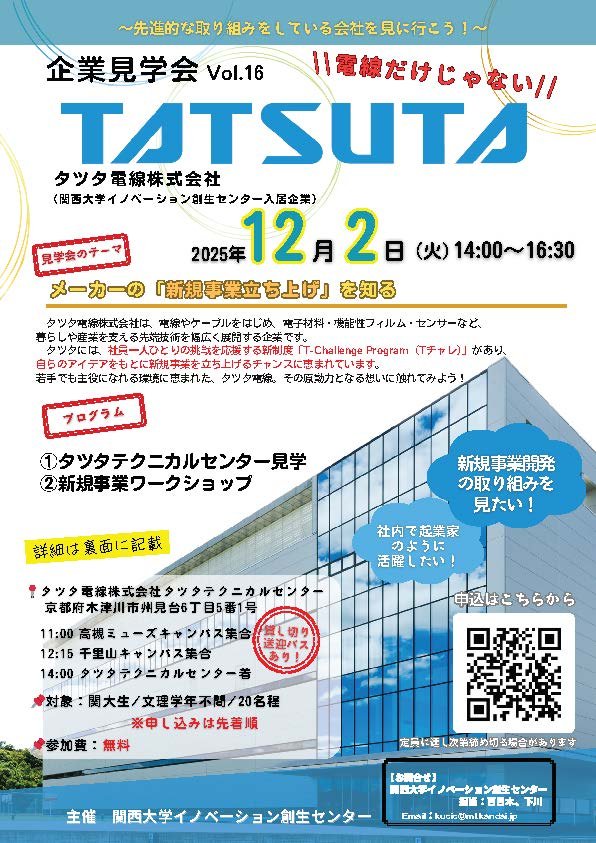 [修正]【企業見学会vol.16】~電線だけじゃない!メーカーの新規事業立ち上げを知る~ 12/2(火) タツタ電線株式会社