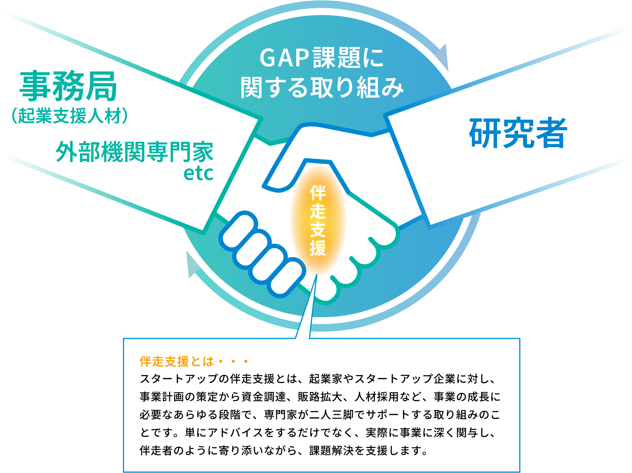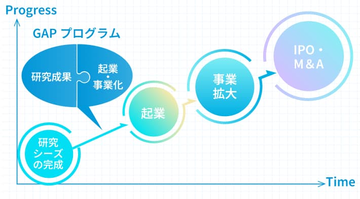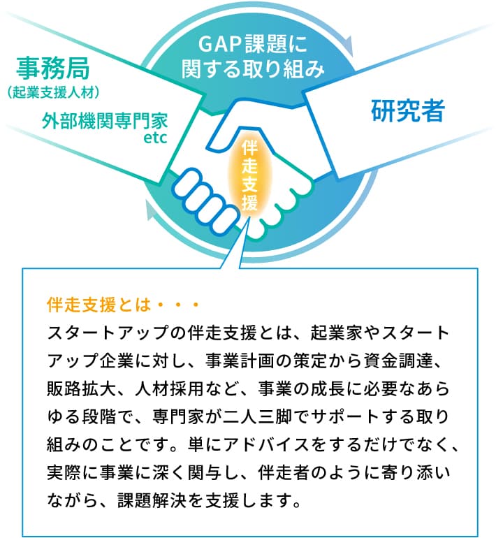 事業化に向けて、研究成果とビジネスの間のギャップを埋めるため、仮説検証を目的とした実証実験や試作品の製作、さらにはビジネスモデルのブラッシュアップやマーケティング等を進めるための資金支援を含めた支援を行います。