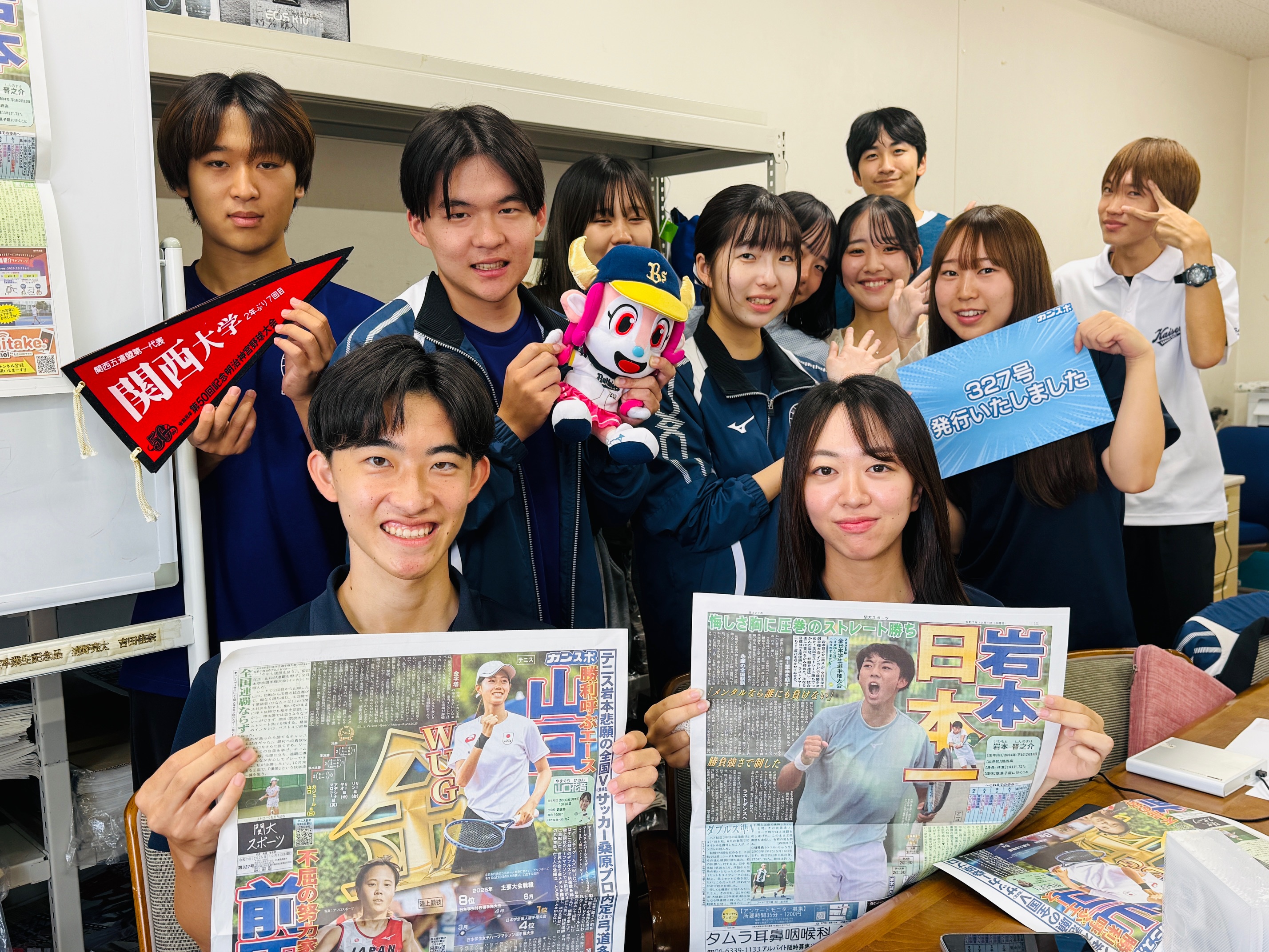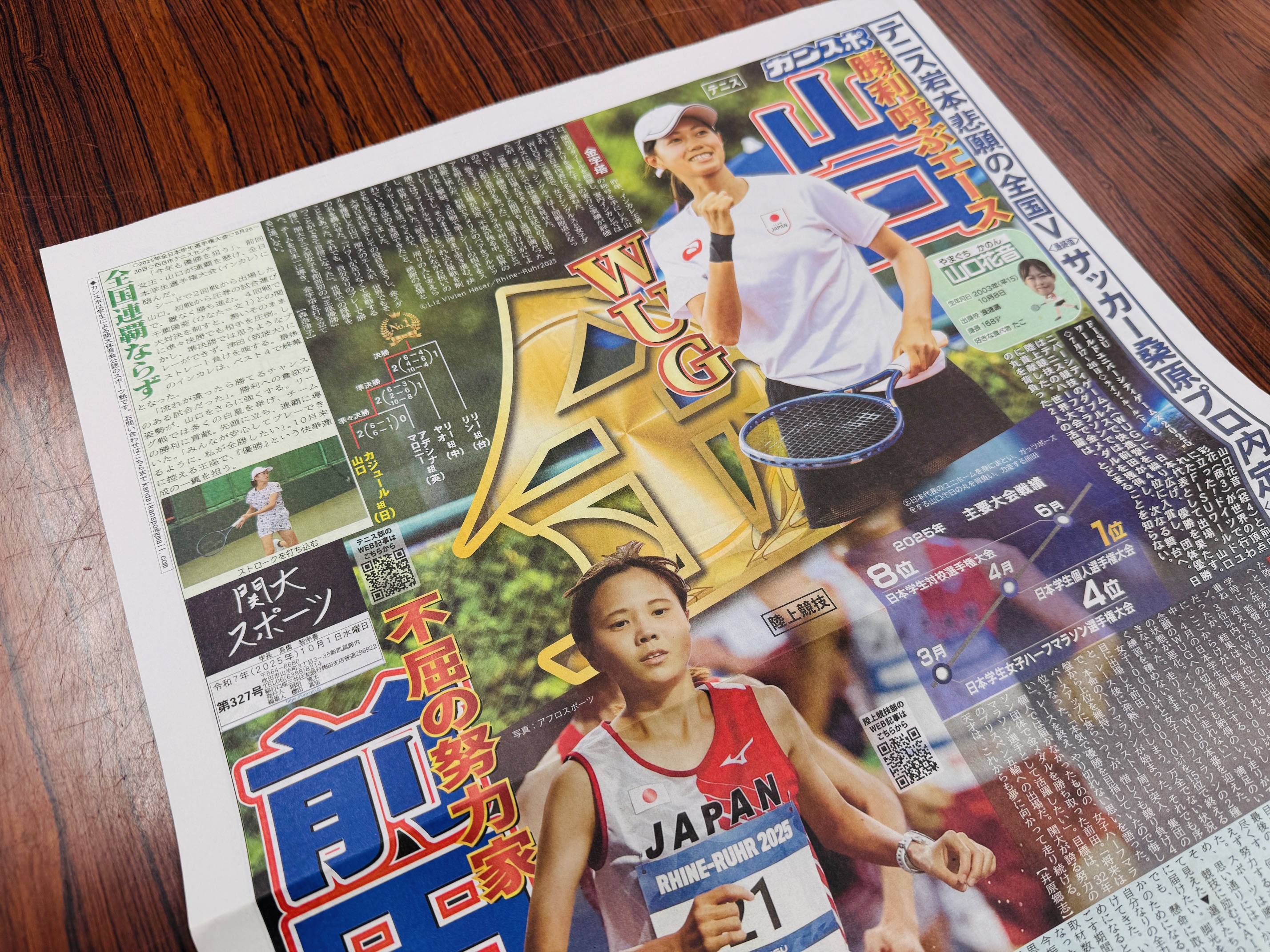 関大スポーツ編集局(櫻田真宙編集長、社会学部3年)が1日、「関大スポーツ第327号」(最新号)を発行しました。1面はワールドユニバーシティゲームズで金メダルを獲得したテニス山口花音(経済学部4年)と陸上・前田彩花(商学部3年)を特集しています。