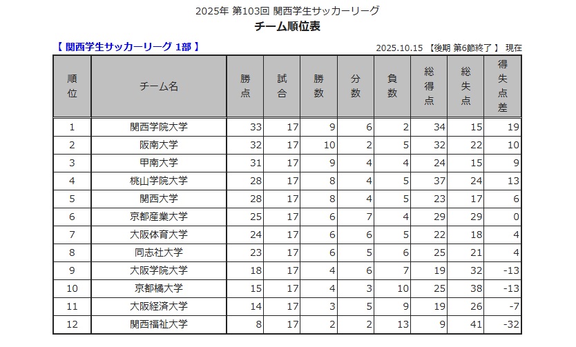 関西学生サッカーリーグ順位表=関西学生サッカー連盟HPより抜粋