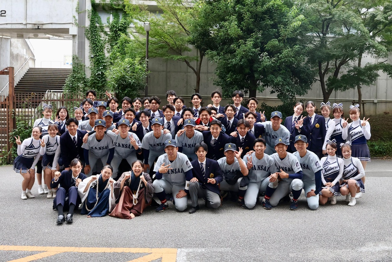 試合後に応援団らと記念写真に収まる野球部=関大スポーツ提供