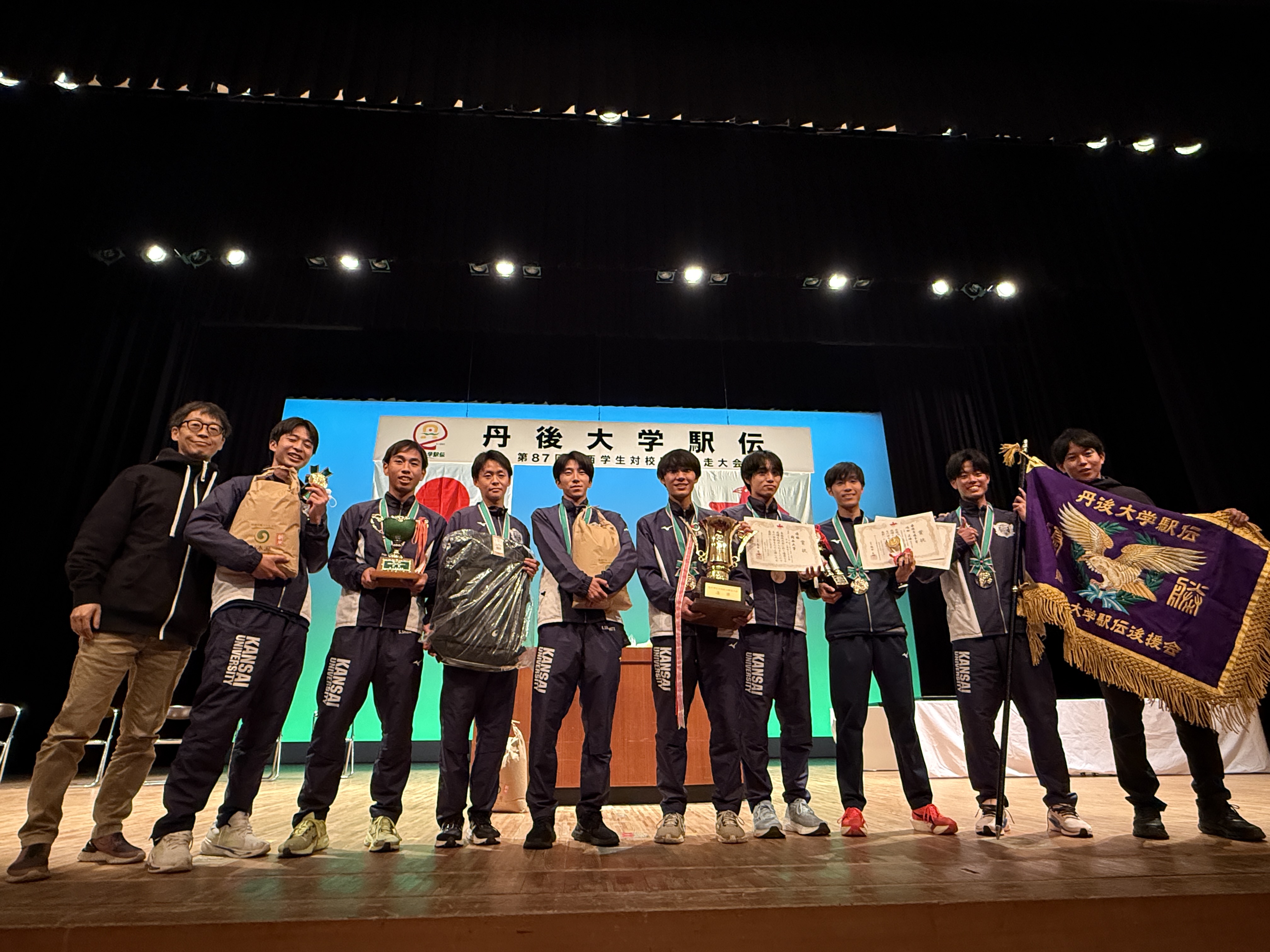 丹後大学駅伝(第87回関西学生対校駅伝競走大会)が15日、宮津市民体育館から京丹後はごろも陸上競技場までの8区間74.7キロで行われ、関西大学(岡村・秋山・芝・糟谷・坂本・嶋田・谷村・平野)は3時間45分55秒の大会新記録で1969年以来56年ぶり12回目の優勝を果たしました。=上記動画=