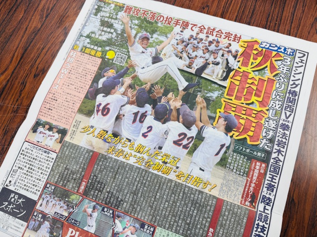 関大スポーツ編集局(櫻田真宙編集長、社会学部3年)が19日、「関大スポーツ第328号」(最新号)を発行しました。1面は3年ぶりに関西学生秋季リーグ戦を制したソフトボール部男子を特集しています。