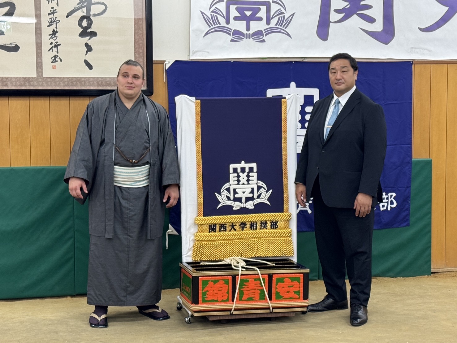 ・【関大相撲】関大相撲部練習生から大相撲関取へ!ウクライナ出身の安青錦が十両昇進果たして相撲部から化粧まわし贈呈!!安青錦「素敵な化粧まわしを着けて九州場所では優勝目指して頑張りたい」