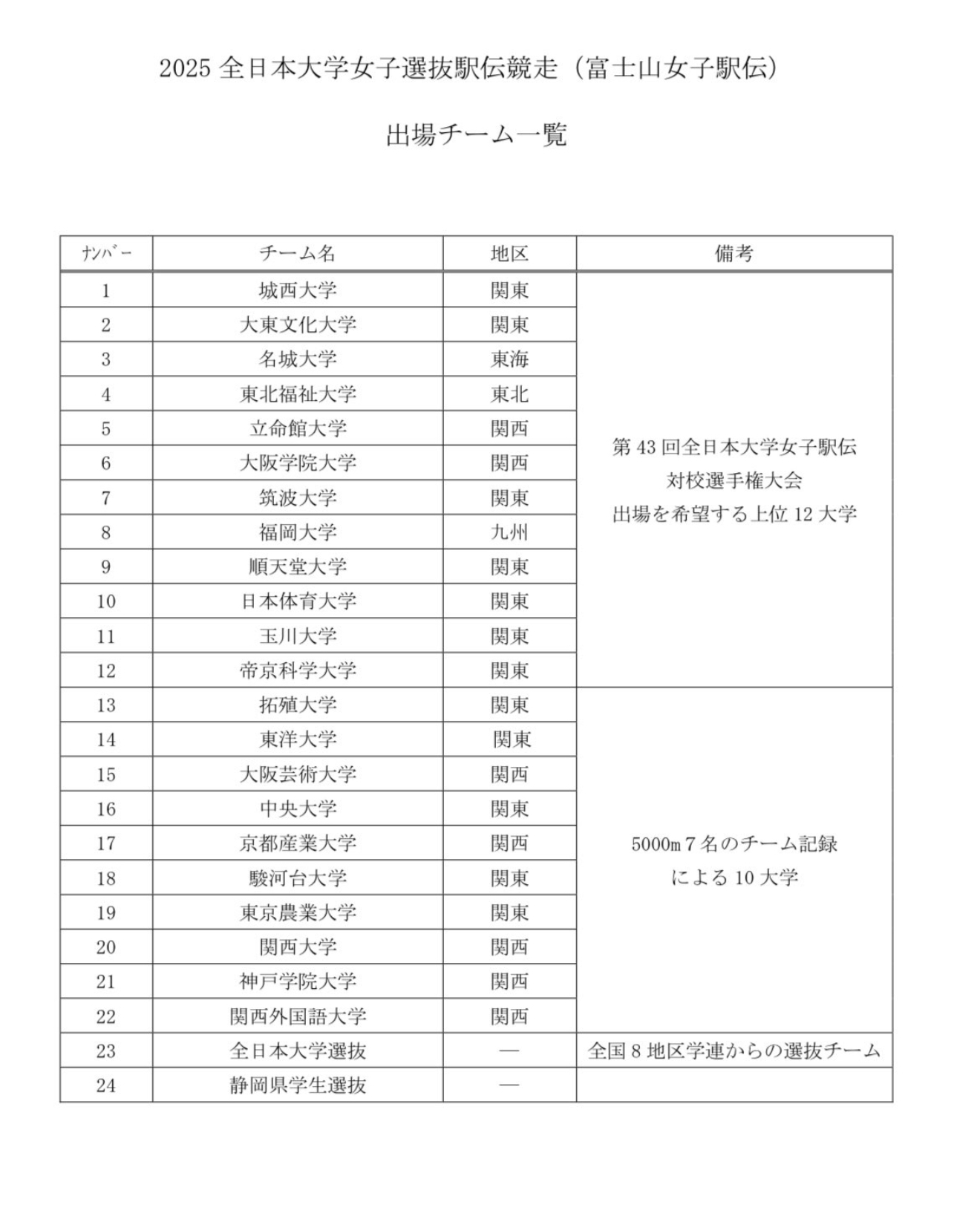 2025全日本大学女子選抜駅伝「富士山女子駅伝」出場校を知らせる文書