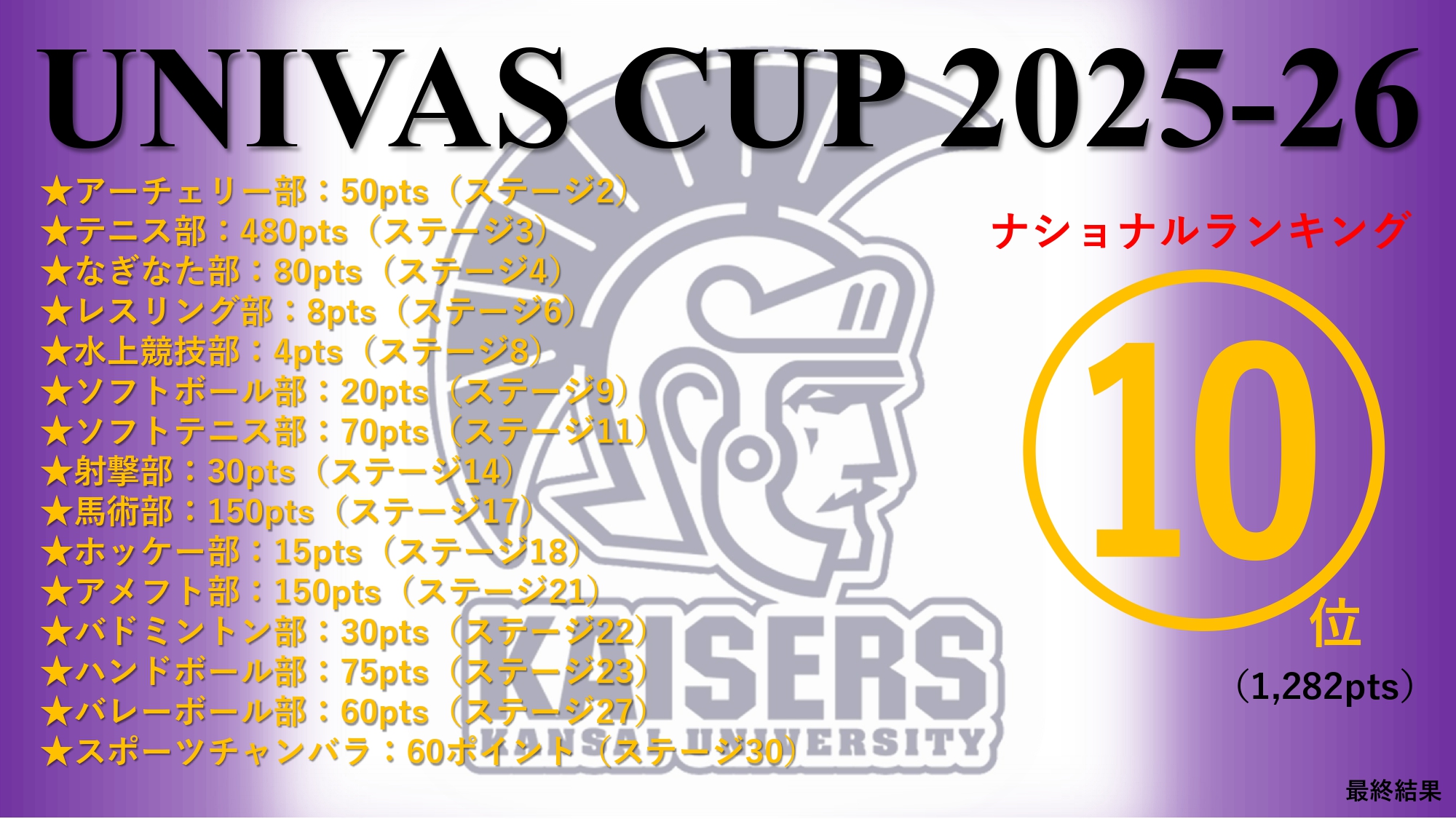 大学スポーツ協会「UNIVAS」が主催する競技横断型大学対抗戦 「UNIVAS CUP 2025-26」の最終結果を発表し、関西大学は1282ポイントを獲得して全国総合ランキング10位にランクインしました。