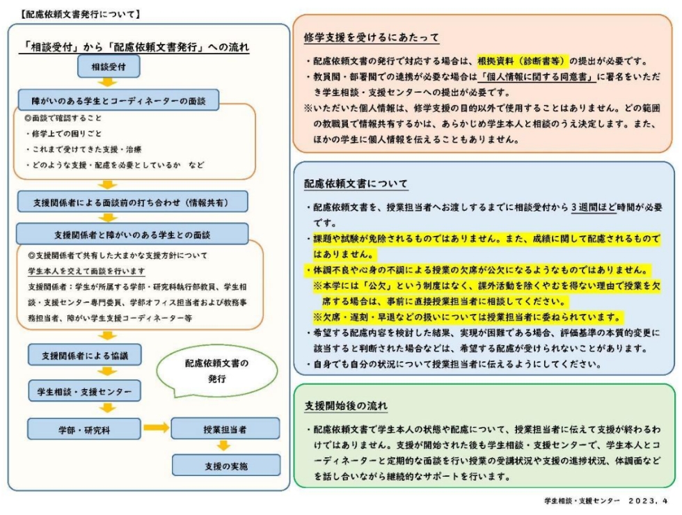 - 配慮依頼文書で学生本人の状態や配慮について、授業担当者に伝えて支援が終わるわけではありません。支援が開始された後も学生相談・支援センターで、学生本人とコーディネーターと定期的な面談を行い授業の受講状況や支援の進捗状況、体調面などを話し合いながら継続的なサポートを行います。