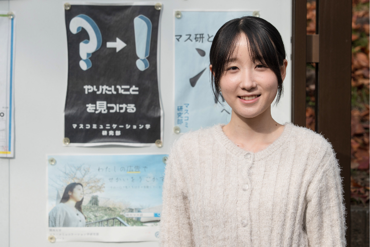 マス・コミュニケーション学研究部(通称:マス研)に所属しています。マス研は現在、映像・出版・広告のパートに分かれて約60人の部員が活動をしています。私は広告パート長として、キャッチコピーやポスターの制作、販促企画、運営などを担当しています。専門的で多様な視点を持っている部員が多く、自分の個性や関心を生かして自由に活動できるところがマス研の魅力です。出版パートでは、新入生歓迎の際に配布する冊子の作成もしています。