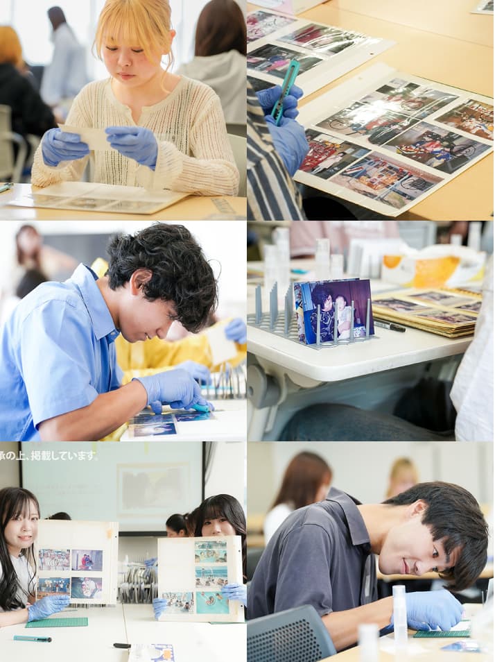 第4回目は「仕上げ作業」と「アルバム作成」を行いました。1枚1枚丁寧にアルコールで拭き上げた写真を新しいアルバムに収め、持ち主の方のもとへお返しする準備を進めました。参加学生は写真に写る風景や表情から持ち主の方の思い出に思いを寄せながら、最後まで心を込めて作業に取り組みました。活動後にはグループでの振り返りを行い、写真を通して人の想いに触れる活動の意義について共有しました。