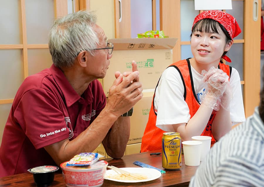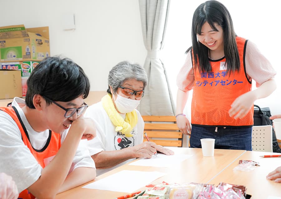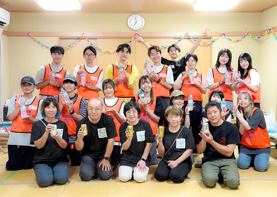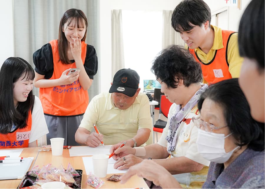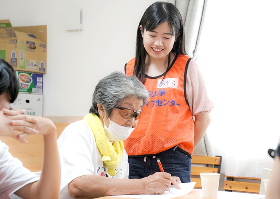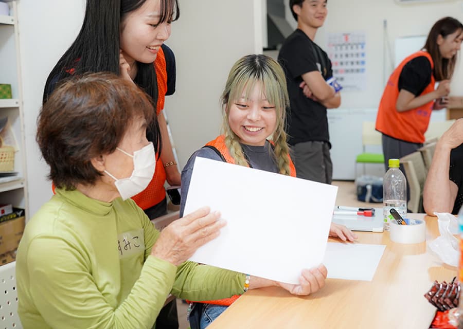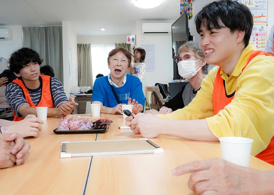 現地の方々に少しでも楽しい時間を過ごしてもらいたいと、学生自らレクリエーションを企画、「魚へん漢字クイズ」や「絵しりとり」などを実施しました。会場には笑い声があふれ、学生と地域の方々が和やかに心通わせるひとときを過ごしました。