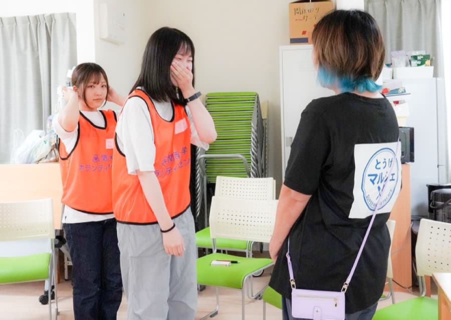 学生たちは前夜に練習を重ね、被災された方々の気持ちに寄り添うことを大切に、笑顔で活動に取り組みました。