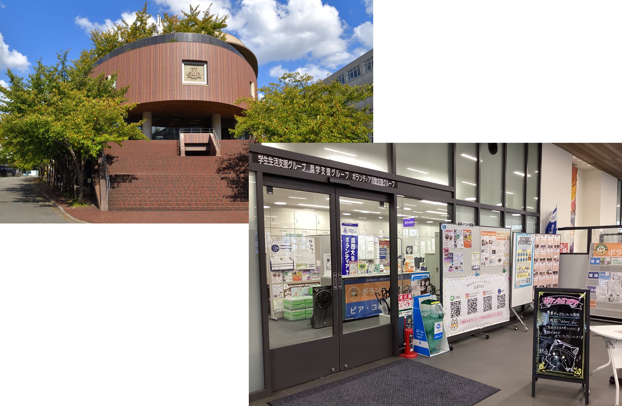 上記MAPの25番の建物 凜風館1階学生センター内にボランティアセンターがあります。